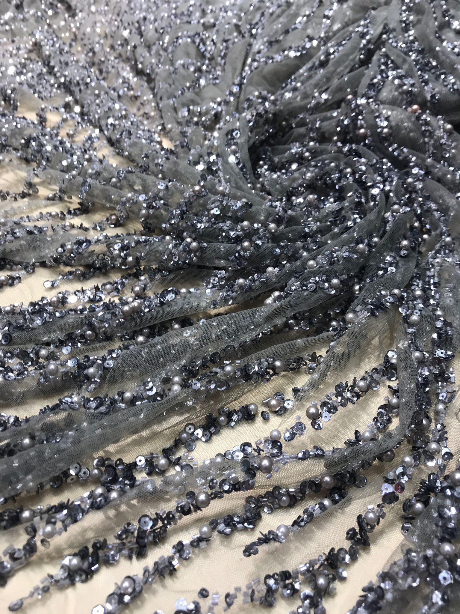 atașarea mărgelelor și paietelor la materialul de bază, pentru a crea un efect strălucitor și sclipitor.