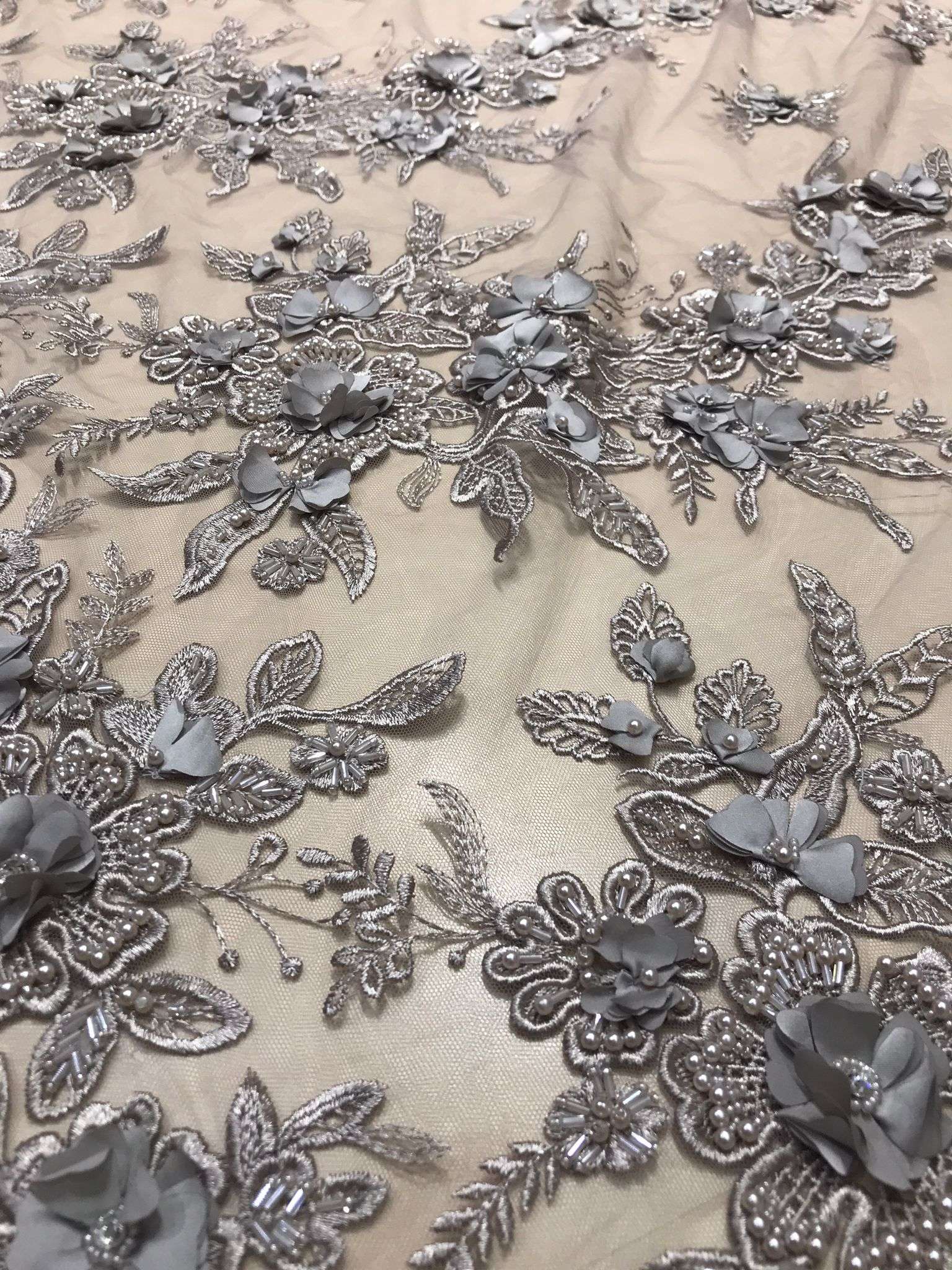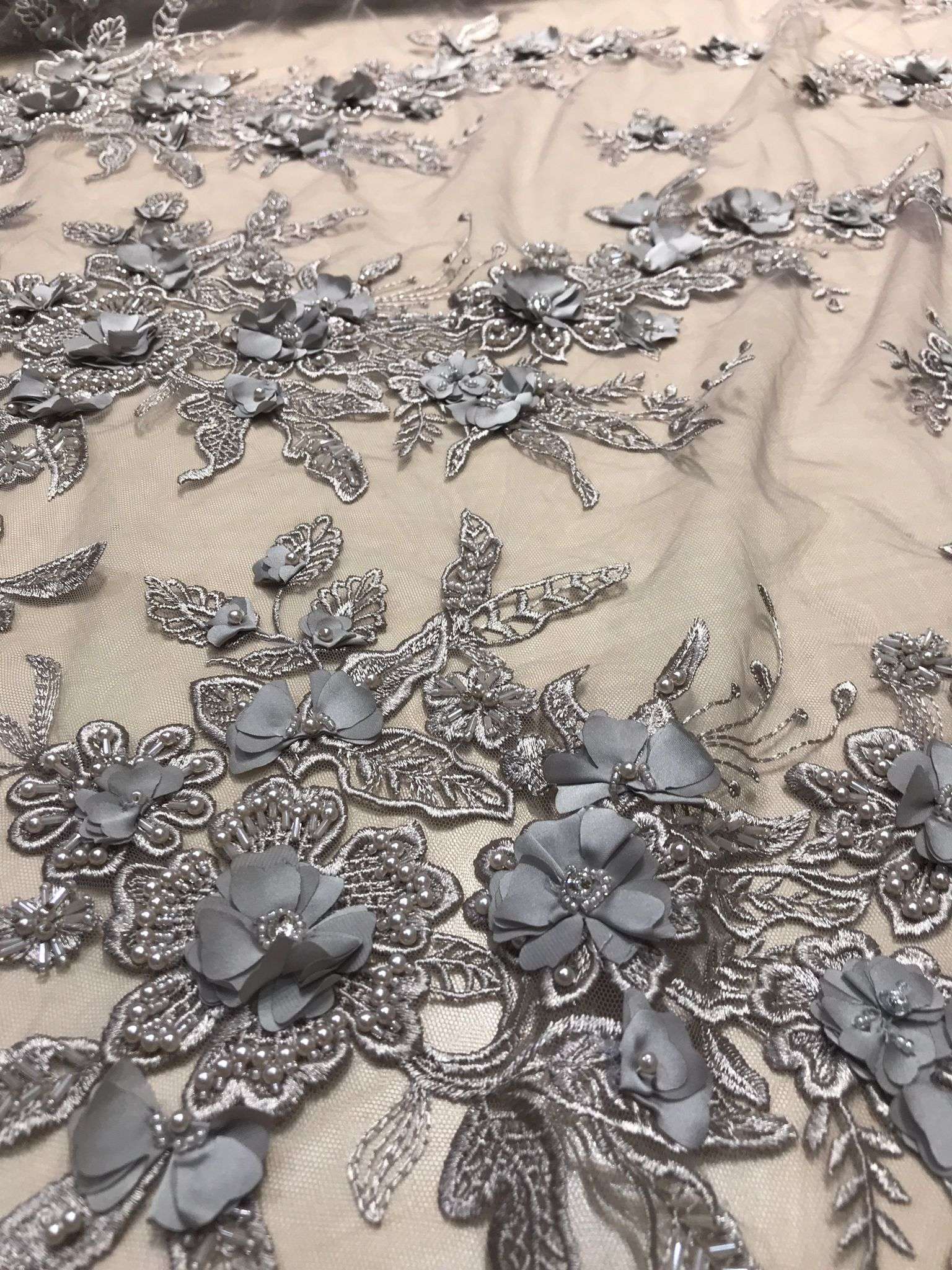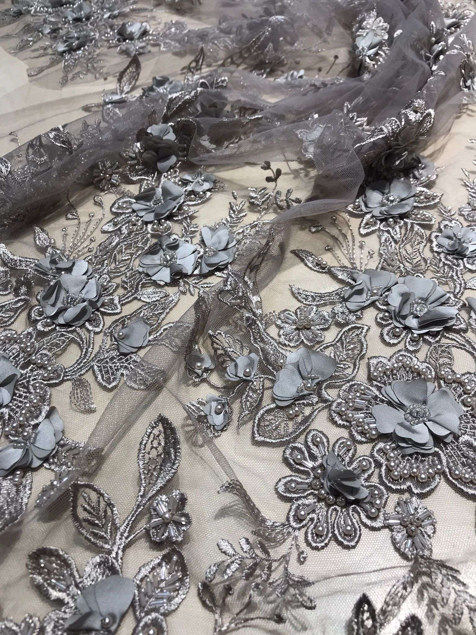 Dantelă grej cu flori 3D