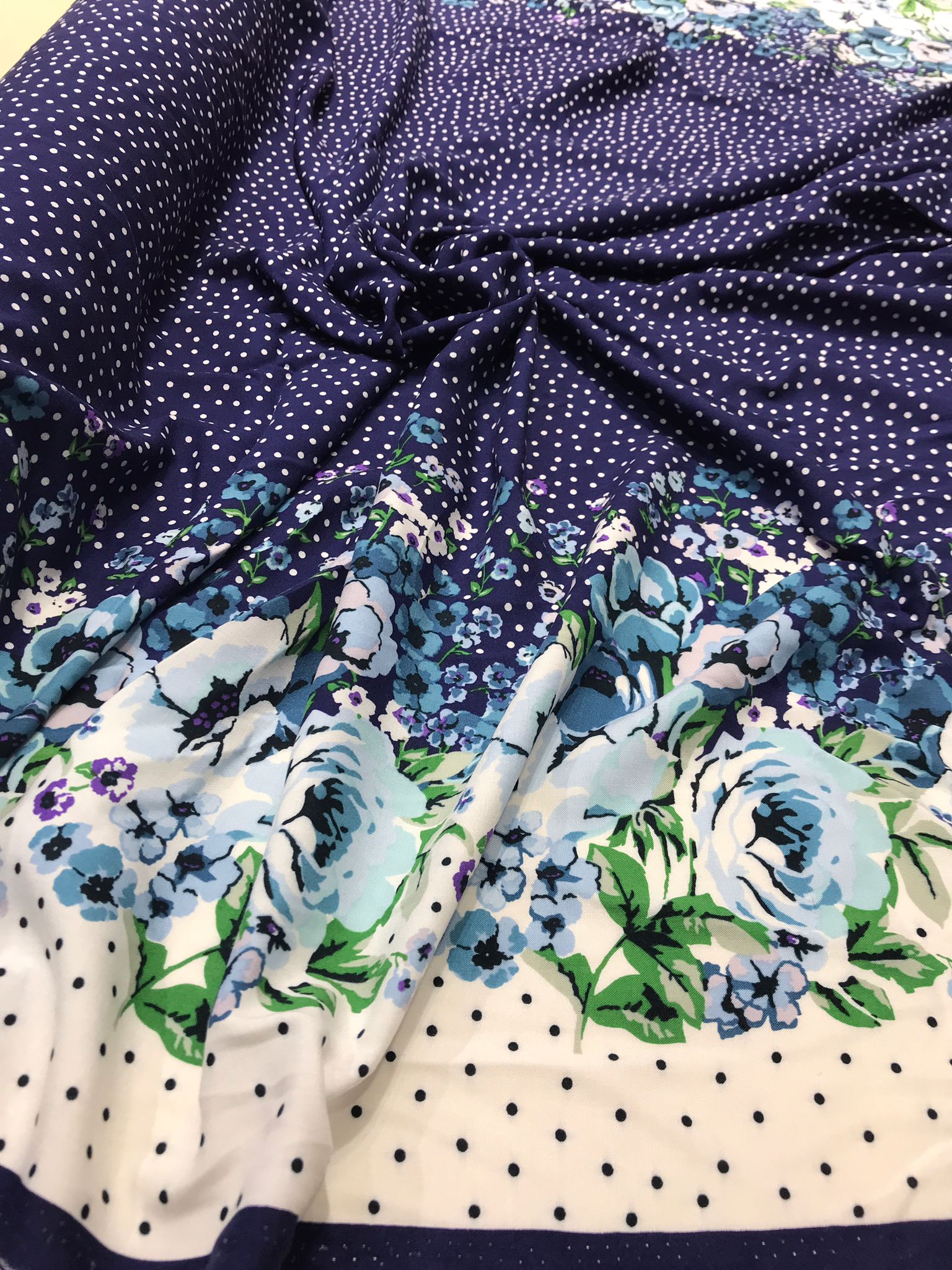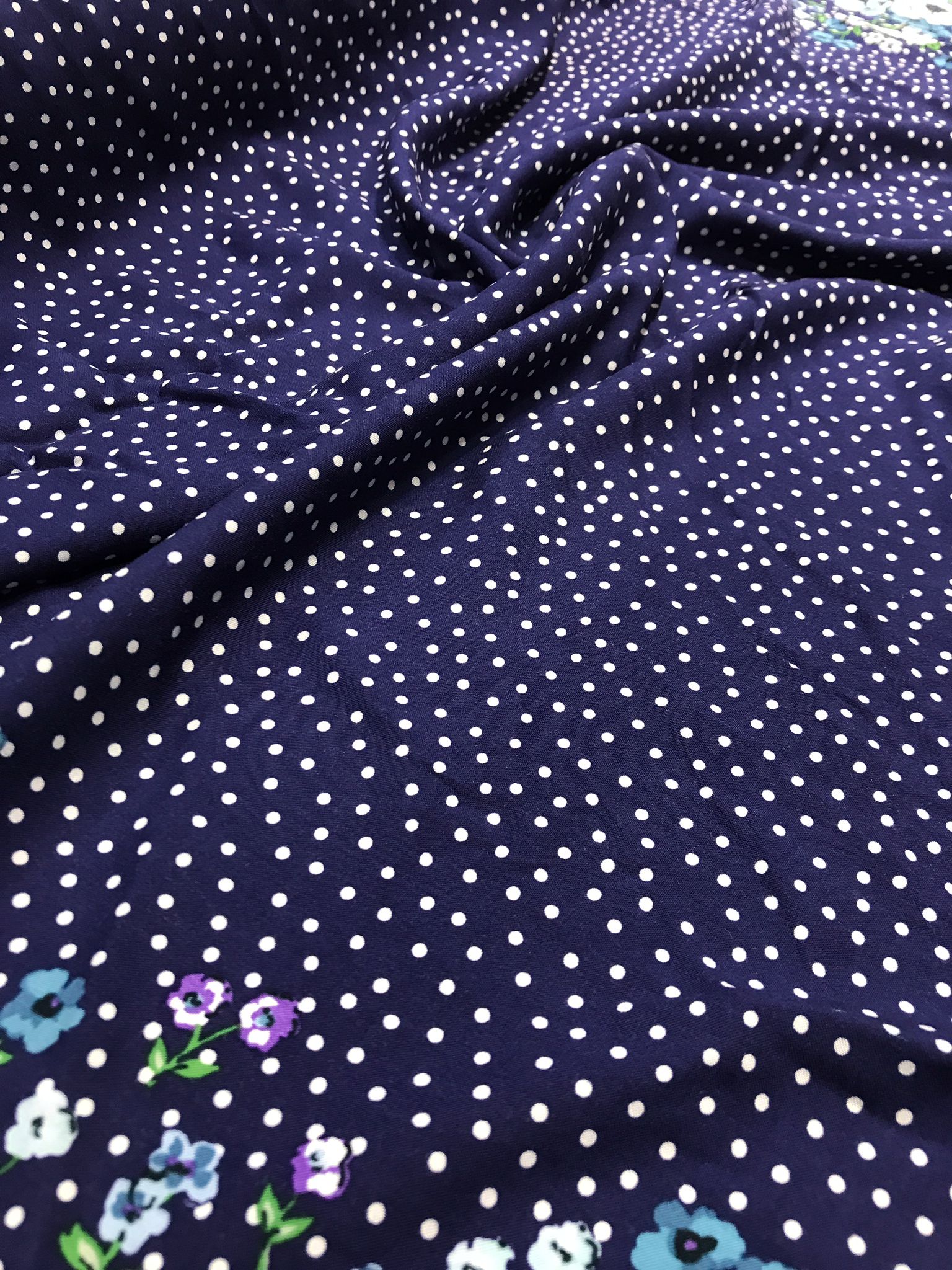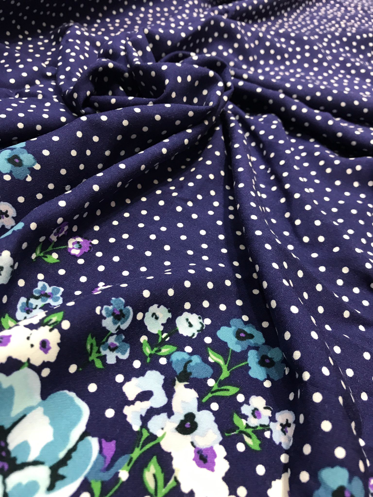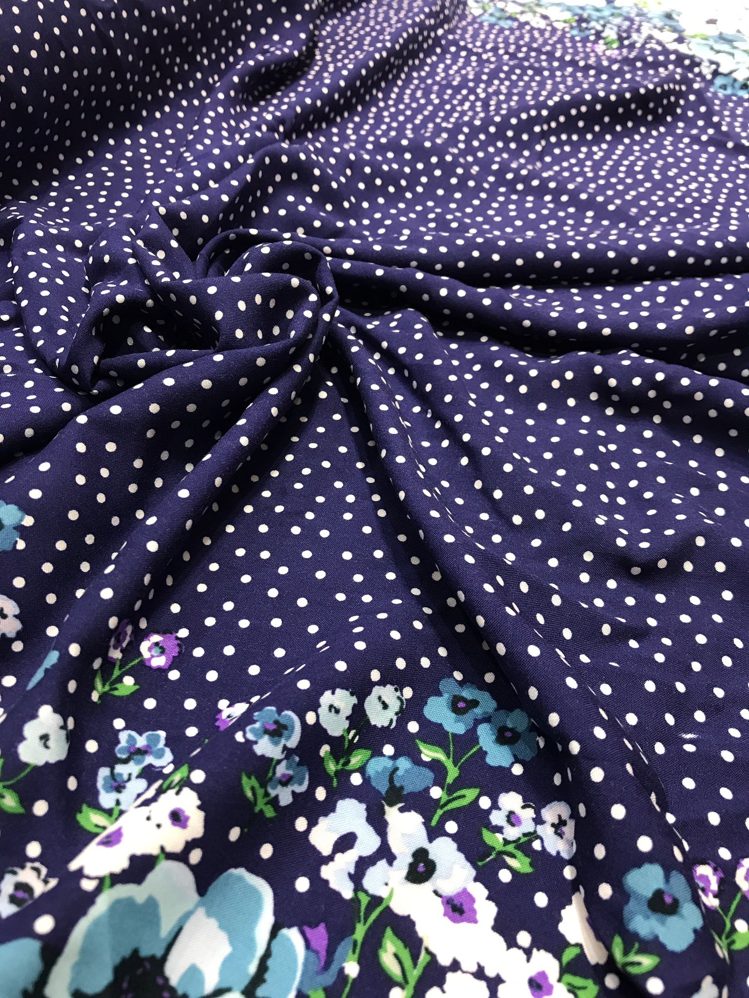 Țesătura este foarte versatilă datorită combinației de imprimeu floral și buline, dar și datorită texturii fluide și moi.